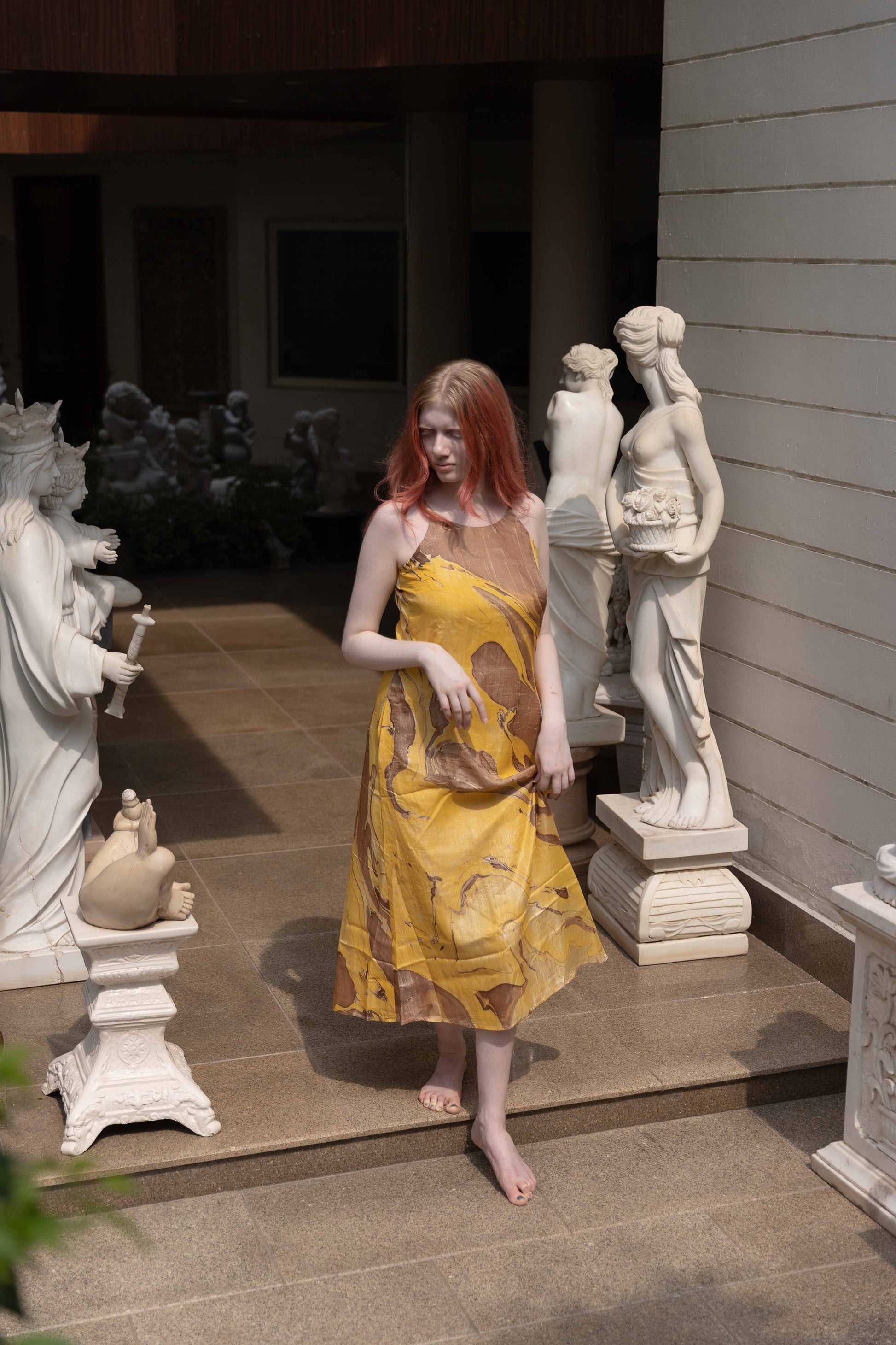 This yellow, beige, and brown marbled slip on dress is handpainted with mineral pigments on recycled banana stem yarn from Madhya Pradesh. The fabric has a subtle lusture making it a vegan alternative to silk. The pigment combinations are poured in a local fresh water pond and the fabrics are dip dyed in it to get the marbled prints. Each fabric is a one-of-a-kind design each and even though the color schemes repeat, two fabrics cannot be same ever. This slip on dress is A-lined with adjustable straps, and closes on the back with a zipper. Hand Wash/Dry Clean recommended.