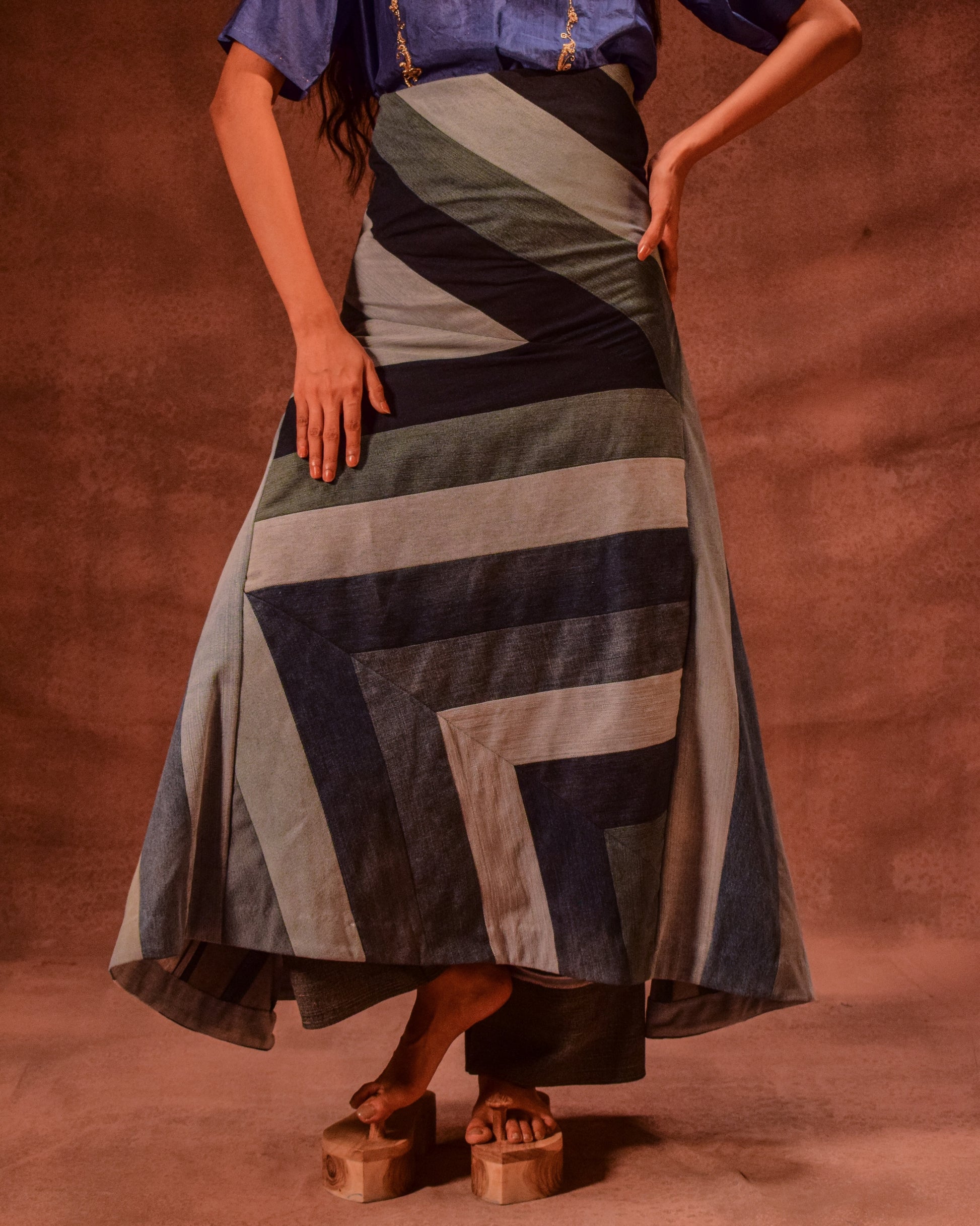 A creative take on paneling, this lightweight skirt features strategically placed stripes that create an illusion of movement and depth. Designed for versatility, its unique construction allows it to be styled as both a skirt and a dress, making it a dynamic and multifunctional piece in any wardrobe.