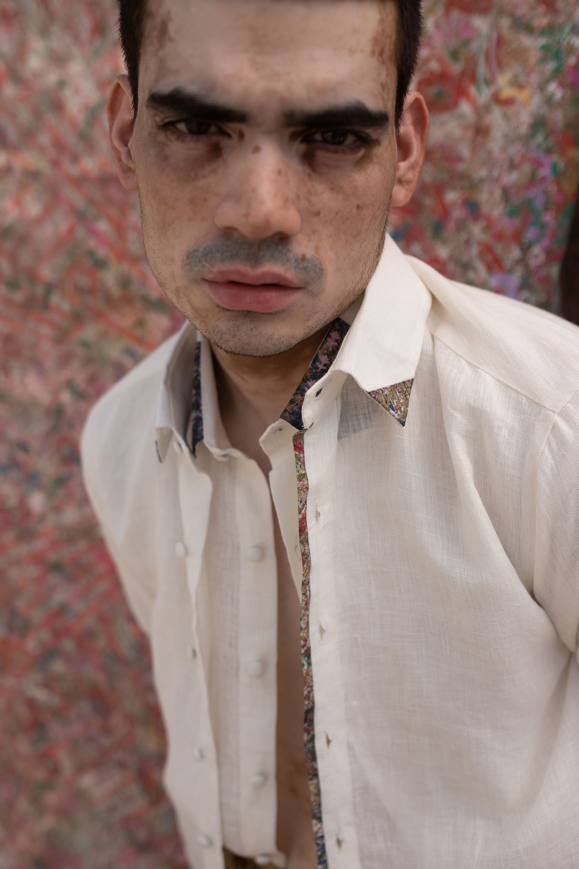 This shirt has a Patina block printed one-of-a-kind fabric half collar detail.