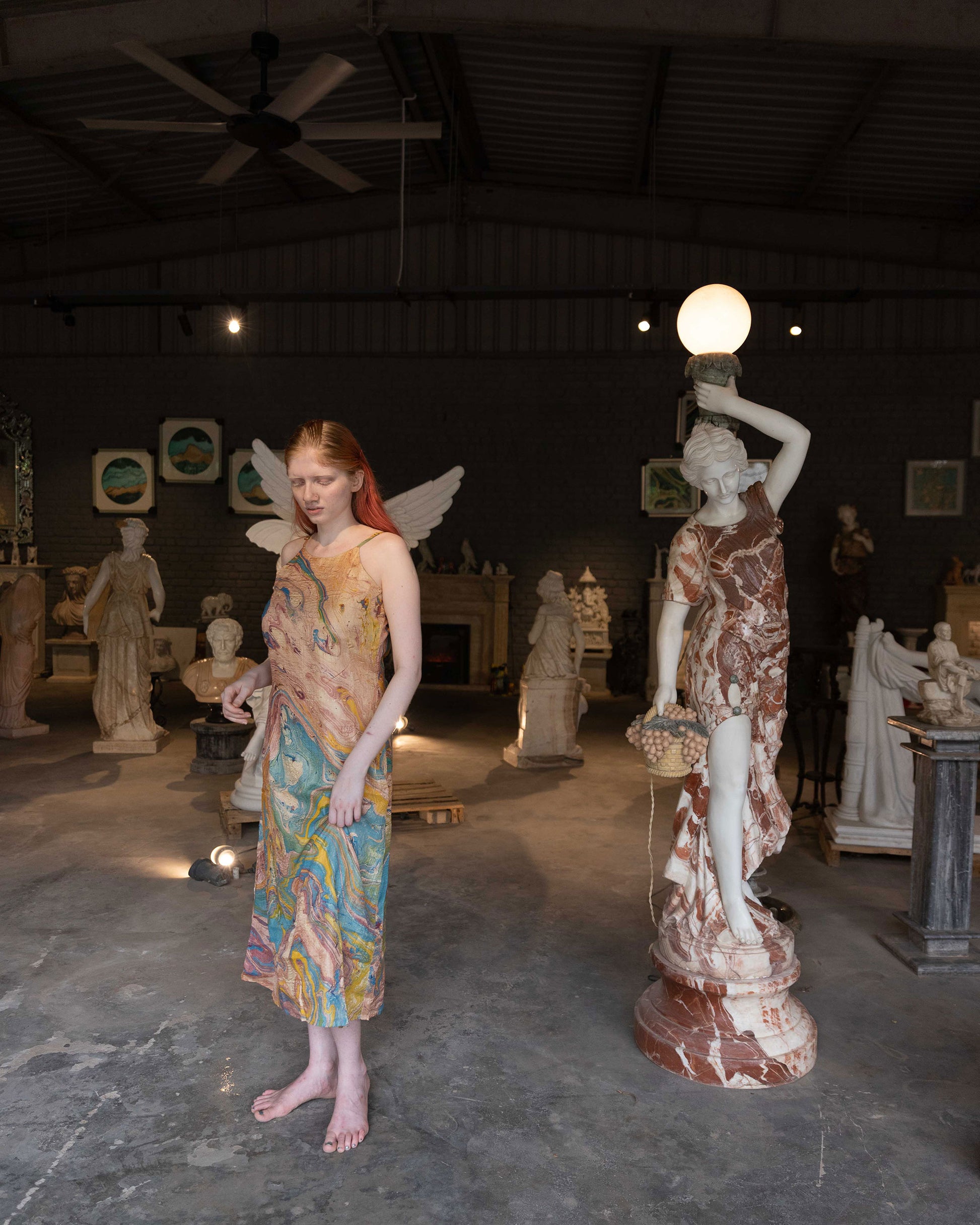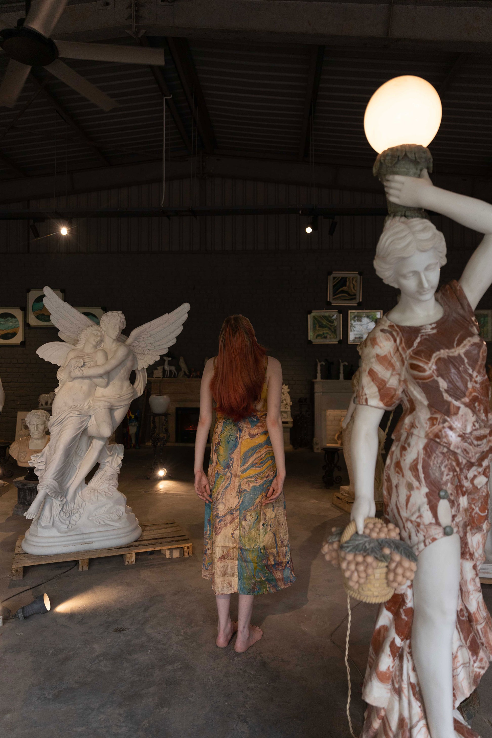 This pastel mix of pink, blue, green, yellow, and beige marbled slip on dress is handpainted with mineral pigments on recycled banana stem yarn from Madhya Pradesh. The fabric has a subtle lusture making it a vegan alternative to silk. The pigment combinations are poured in a local fresh water pond and the fabrics are dip dyed in it to get the marbled prints. Each fabric is a one-of-a-kind design each and even though the color schemes repeat, two fabrics cannot be same ever. This slip on dress is A-lined with adjustable straps, and closes on the back with a zipper. Hand Wash/Dry Clean recommended.