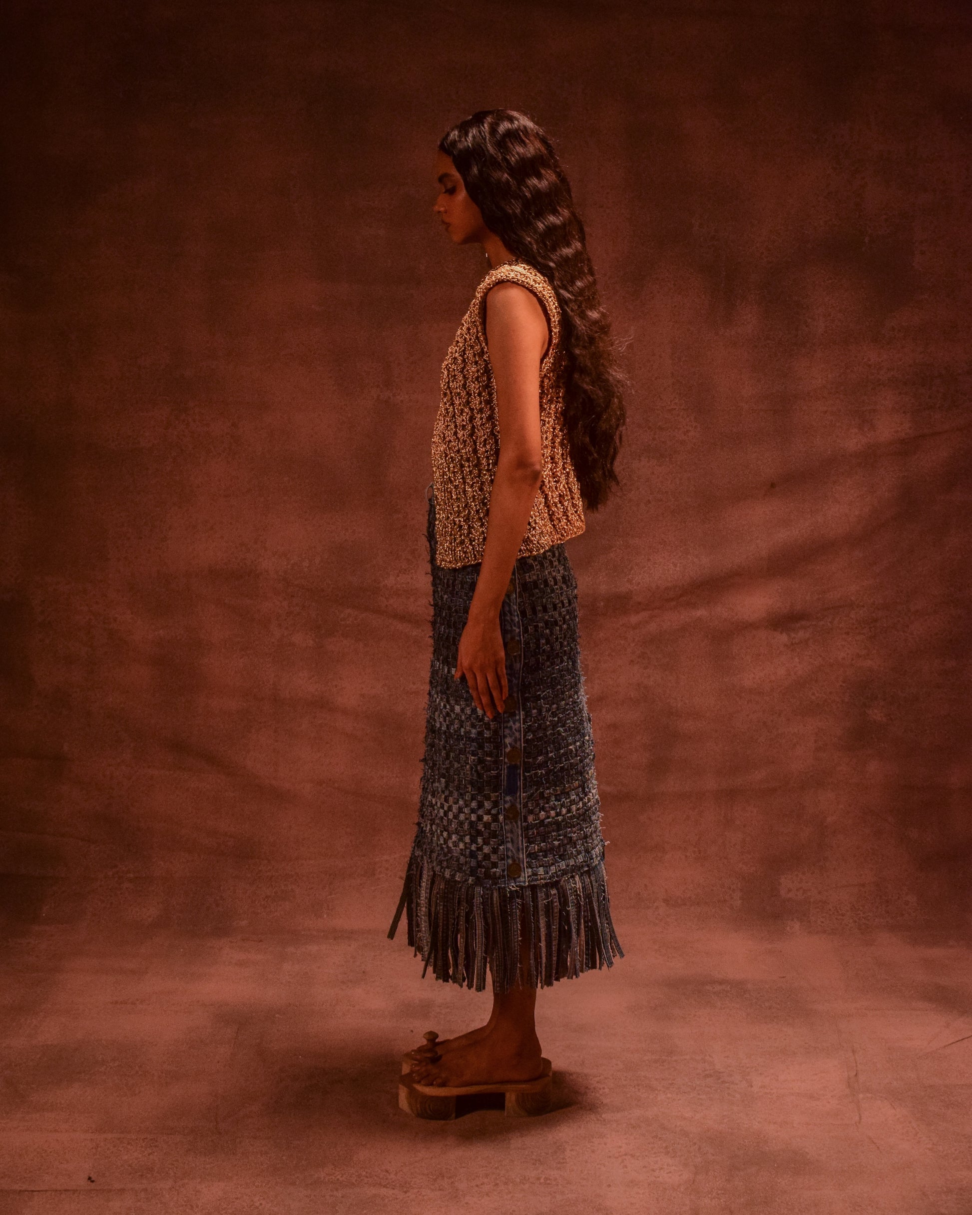 Our Selvedge Fringe Skirt is crafted by inter-weaving denim flat-felled seams and selvedge. It features a playful fringe at the hem made from the same selvedge fabric. Decorative metal coins dangle from the side seam, adding movement and sparkle as you walk. The piece is finished with a structured denim waist belt that ensures a secure, stylish closure.