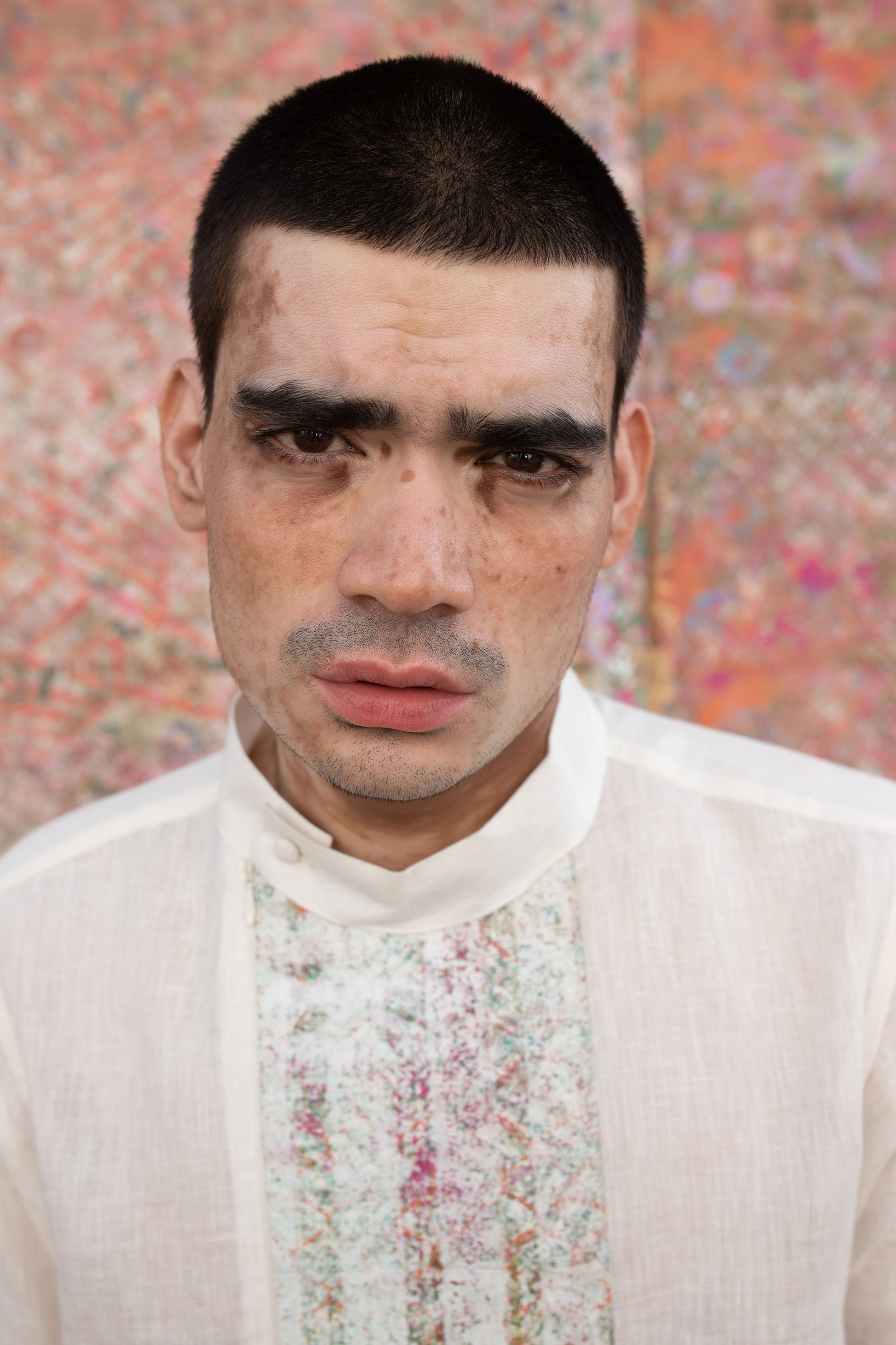 This shirt has a Patina block printed one-of-a-kind fabric front box strip detail with a concealed zipper closure.