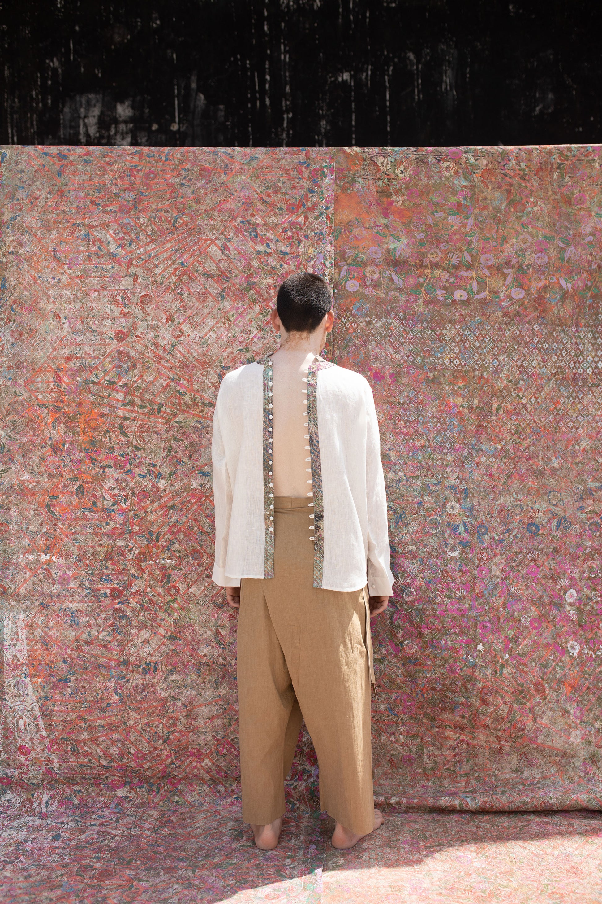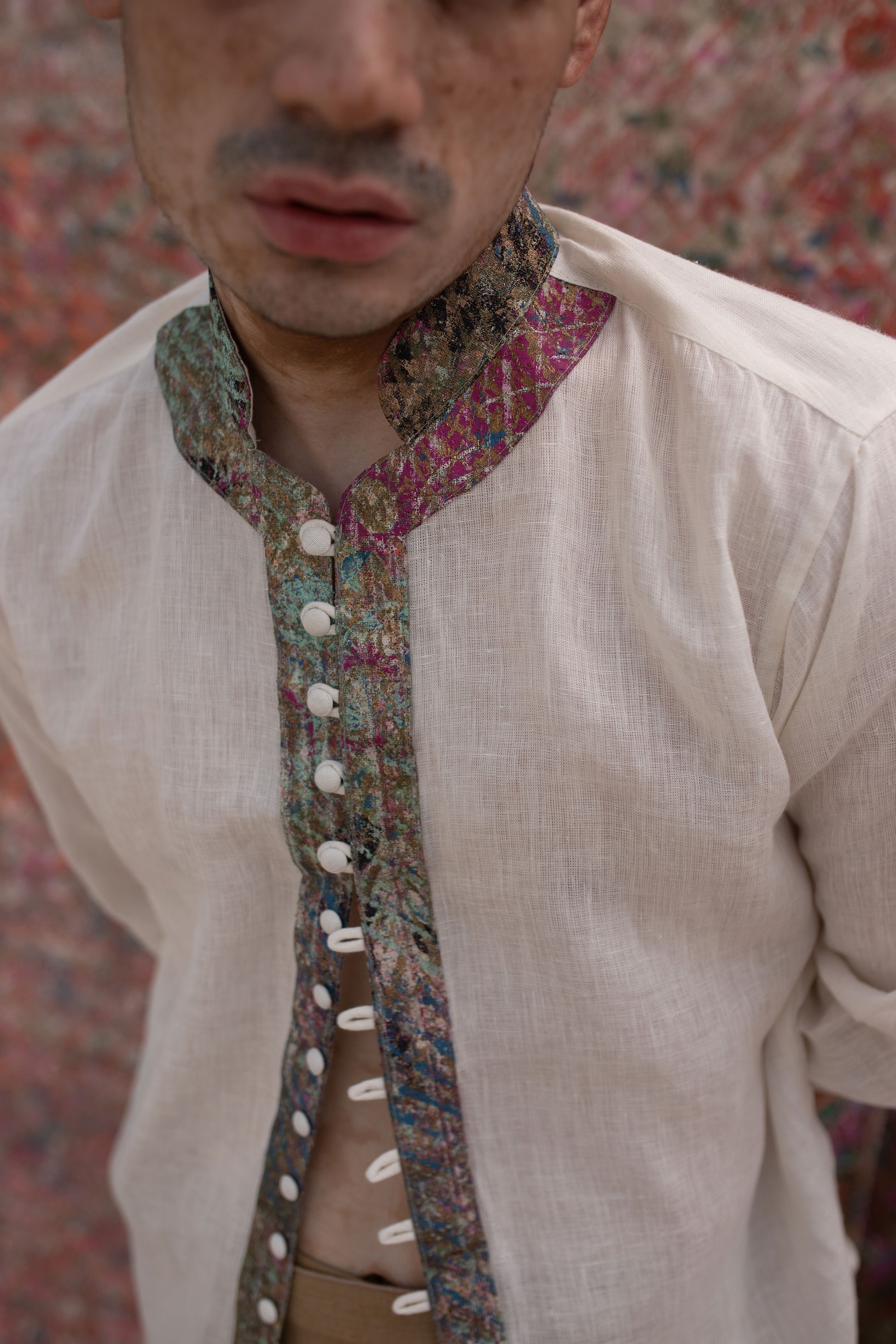 This shirt has a Patina block printed one-of-a-kind fabric placket detail with potli buttons.