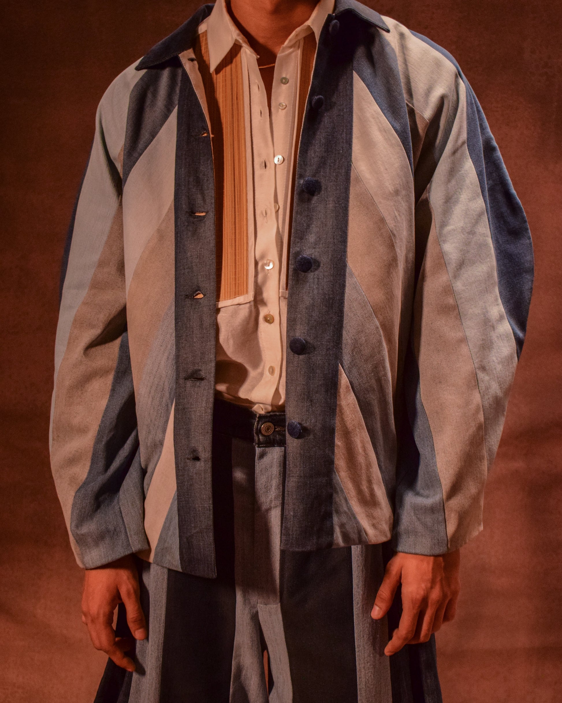 Striped Jacket features over‑exaggerated shoulders that portray power, control and strength. Panels of bold denim are color blocked to enhance the silhouette. The sleeves are curved into a definitive shape. A commanding piece designed for confidence and statement making. Paired best with our Lamp Pants and Chatai Shirt.